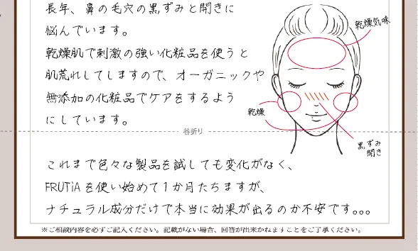 肌が乾燥して敏感なので、無添加化粧品を使っています。これまで色々な製品を試しても変化がありません。FRUTiAを使い始めて1か月たちますが、ナチュラル成分だけで本当に効果が出るのか不安です。